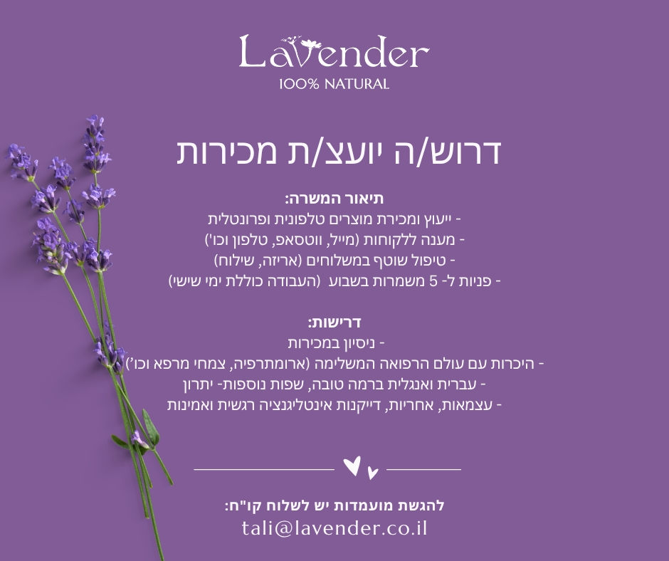 לבנדר קוסמטיקה טבעית מפתחת, מייצרת ומשווקת בחנויות החברה ובאתר האינטרנט וכן במוקד טלפוני את מוצרי החברה המיוחדים במינם. אם אתם אוהבי טבע וחושבים שתוכלו לתרום ולעזור להביא את המהפיכה הטבעית לארץ השאירו לנו פרטים. בדף זה גם תמצאו משרות עדכניות על תפקידים פנויים בלבנדר. גם אם אין משהוא כרגע מוזמנים לשלוח פרטים, אולי יש משהו שטרם פורסם.
