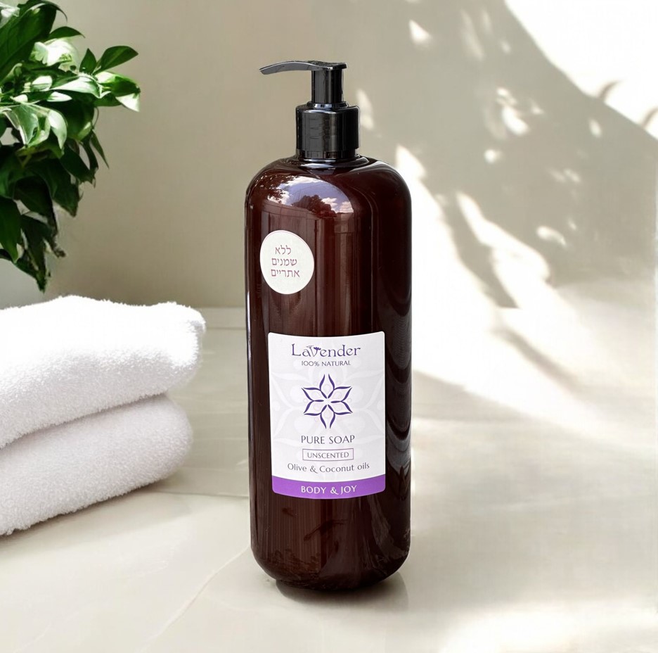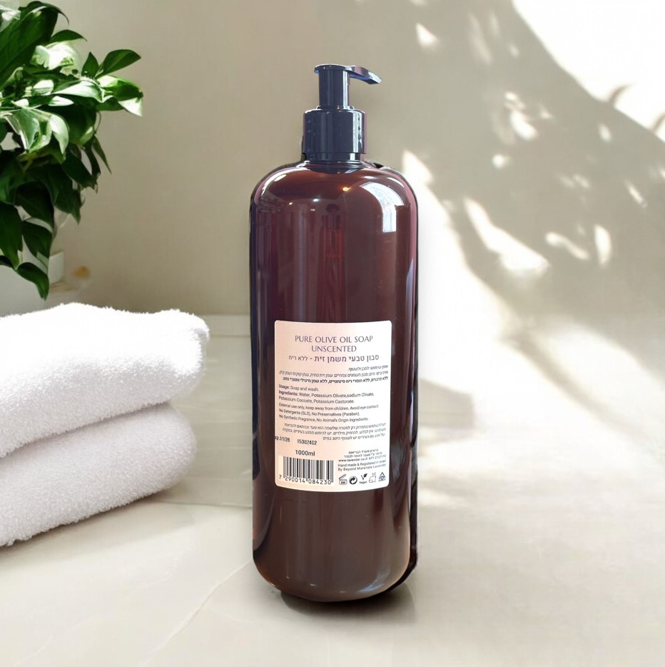 סבון נוזלי משמן זית כתית ללא ריח (ללא שמנים אתריים). סבון עדין לגוף, מבוסס על שמן זית כתית המנקה ביסודיות ועדינות ושומר על הלחות הטבעית של העור. הסבון מצוין לבעלי עור רגיש או לרגישים לריחות המחפשים סבון 100% טבעי ללא ניחוח. מתאים לכל הגילאים.הסבון אינו מכיל SLS, תוצרי לוואי של נפט או חומרים משמרים.