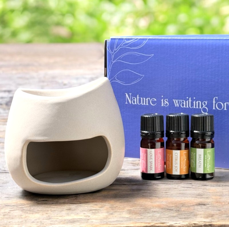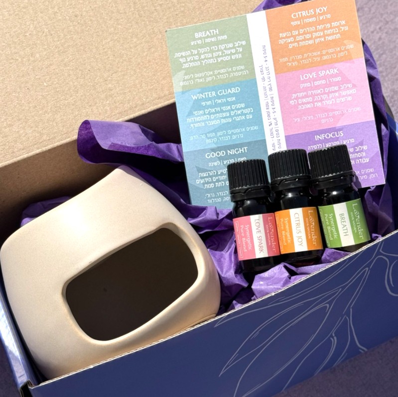 ערכת ארומתרפיה מיוחדת הכוללת מבער שמנים מקרמיקה, יחד עם תערובות שמנים אתריים טהורים שנרקחו במיוחד לאווירה ייחודית ולשימוש בארומתרפיה.