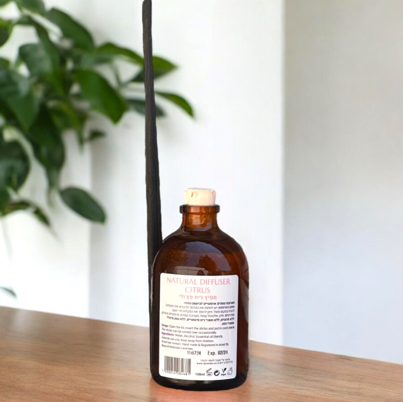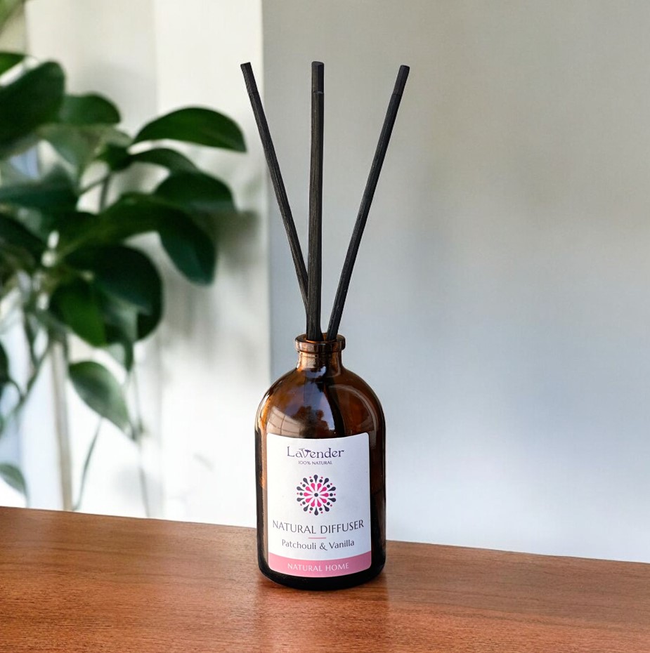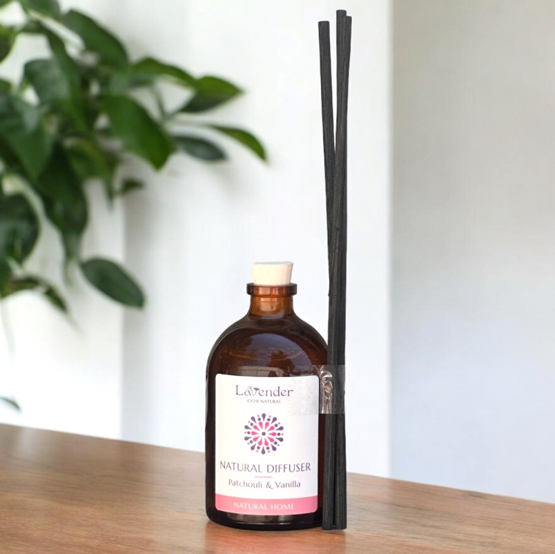 מפיץ ריח עם מקלות, 100% טבעי לטיהור וריענון האוויר והאווירה, בניחוח ניחוח פצ’ולי וניל עמוק ונעים בכל חדר בבית.
