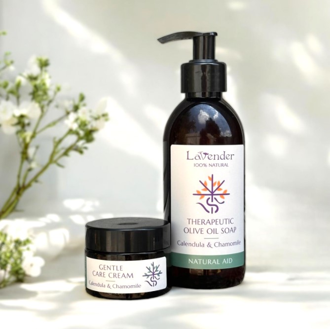 בערכה: סבון טבעי משמן זית (250 סמ”ק) עשיר במיצוי קלנדולה, לבנדר וקמומיל המנקה את העור בעדינות אינו מגרה או מייבש את העור וקרם טיפולי עדין (50 סמ”ק) עם חמאת שיאה אורגנית, תמציות צמחים ושמנים ארומטיים – המעשיר את העור, מרגיע עור מגורה, מזין אותו ושומר עליו בריא ורענן לאורך זמן.